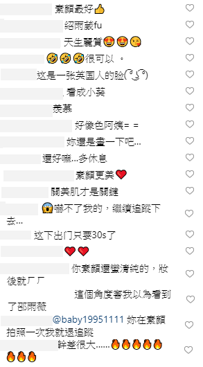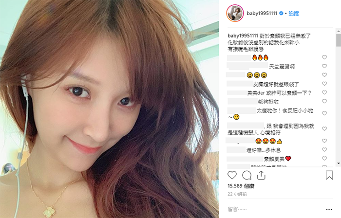 .照片上傳之後,許多網友紛紛留言大讚:「天生麗質啊」、「或許可以素顏一下?」、「素顏更美」、「還是很美」,不過仍有網友調侃她:「妳再素顏拍照一次我就退追蹤」、「我即刻unfollow」、「嚇不了我的」、「一言難盡」、「妳還是畫一下吧…」。