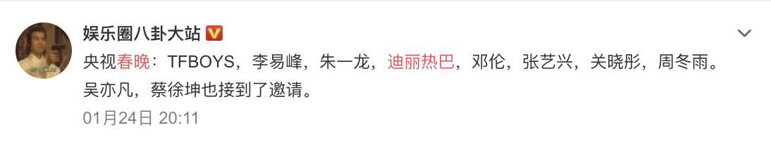 每年過年前各家電視台都會提前錄製春晚的節目,而近期也有消息指出,大陸最大的「央視春晚」將會邀請:TFBOYS、李易峰、朱一龍、迪麗熱巴、鄧倫、張藝興、關曉彤、周冬雨、吳亦凡、蔡徐坤等人,也讓粉絲相當期待。近日,迪麗熱巴也進行節目「直通春晚」的錄製,有消息指稱這次參加直通春晚的藝人都有很大的可能登上春晚舞台。