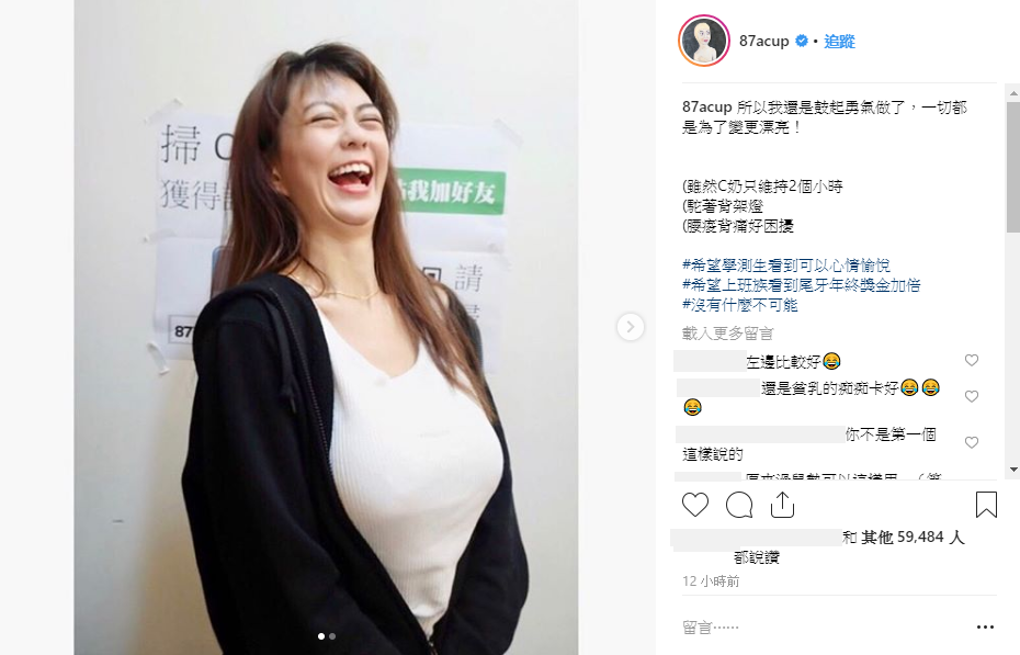 痴痴也打上:「雖然C奶只維持2個小時,駝著背架燈,腰痠背痛好困擾」,體會到了好身材的困擾。這次她搞笑發文,也讓許多網友紛紛留言:「看到痴痴從A-到C就覺得學測有希望了」、「做自己最美」、「原本的痴痴比較正」、「癡癡忽大忽小啊」、「貧乳才是女神!」,看樣子粉絲更喜歡原來的痴痴!