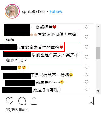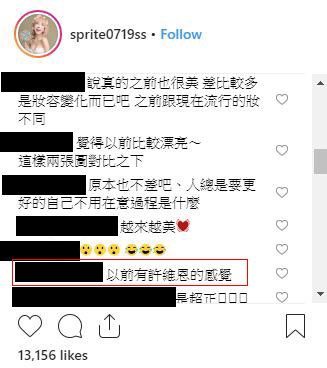 不管網友留言如何,雪碧大方承認臉部有整形,這份坦蕩蕩的作風,與現在藝人網紅不承認自己臉上人工的歲月差異,相較之下真的很直率大方。