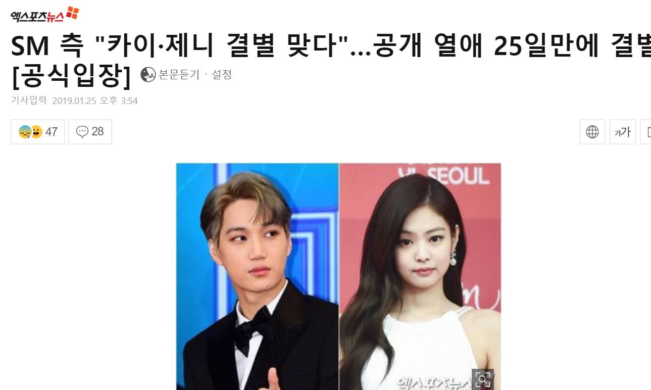 25日,根據美媒《allkpop》報導,Jennie和Kai驚傳已經協議分手,短短4個月的戀情突然告吹,《allkpop》援引消息人士指出,兩人都想專注在各自的演藝事業,消息人士也進一步表示「兩人的分手協議全盤考量到他們隊友、工作人員,甚至是他們的忠實粉絲」。