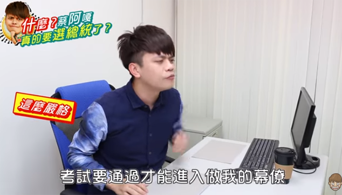 25日阿嘎推出新片,影片中剛開始他就提到:「有不怕死的鄉民要我出來選總統,聽起來是不錯啦,但在選總統之前,我要好好慎選一下我的內閣幕僚」,沒想到接著鏡頭拍到有人來面試,走進來的人,正是臺南市議員「謝龍介」,意想不到的組合讓許多粉絲相當驚喜!