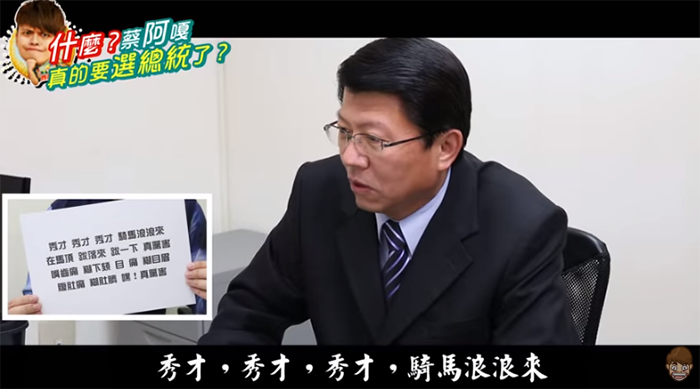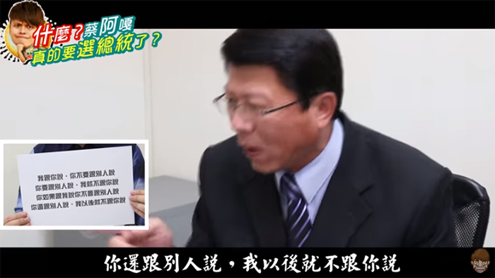 後來阿嘎也問道:「你想要做部長還是什麼院長?」,讓謝龍介笑回:「我的行情做部長太掉漆了」,之後阿嘎則表示:「你要做副總統,厲害有抱負」。台語都非常流利的兩人,這次拍片也都用台語對答,謝龍介還念了兩段台語繞口令,讓阿嘎佩服不已,不過最後阿嘎則搞笑讓謝龍介去找他的秘書等待消息,讓謝龍介十分傻眼!