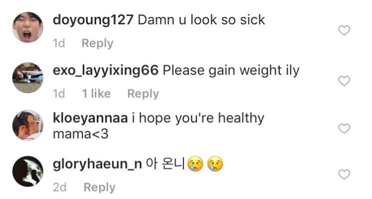 而活動當天,泫雅也將穿搭照分享在個人IG上,私下的她仍和過去一樣或蹲或比起手勢,拍照起來仍相當有氣勢,不同此前在鏡頭前的羞澀,讓粉絲力讚「泫雅女王氣勢回來了」,不過短版上衣露出的細腰,和日漸凹陷的雙頰讓大批粉絲十分擔心,並紛紛說到「注意健康」、「真的不能再瘦了」、「要多吃點」。