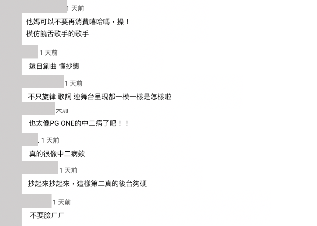 而許多網友在林孟辰表演的影片下方留言:「也太像PG ONE的中二病了吧!!」、「他媽可以不要再消費嘻哈嗎,模仿饒舌歌手的歌手」、「抄起來抄起來,這樣第二真的後台夠硬」、「還自創曲 懂抄襲」、「不只旋律 歌詞 連舞台呈現都一模一樣是怎樣啦」、「不要臉ㄏㄏ」、「真的很像中二病欸」