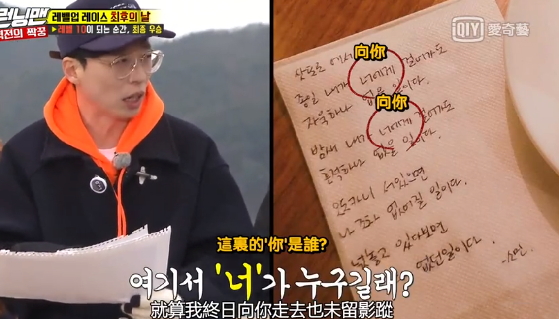 面對全昭旻燃燒的文青魂,眾人不解風情說到「這是在寫什麼」,李光洙更火上加油表示「把這寫在紙巾上,還在旁邊放了一杯咖啡」,接著逼問全昭旻是想寫信給誰,並認為信裡面兩次提到「你」就是全昭旻意有所指。