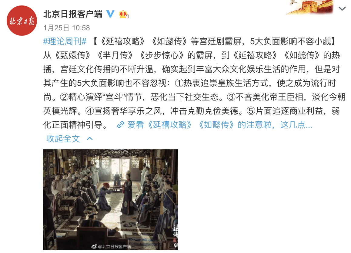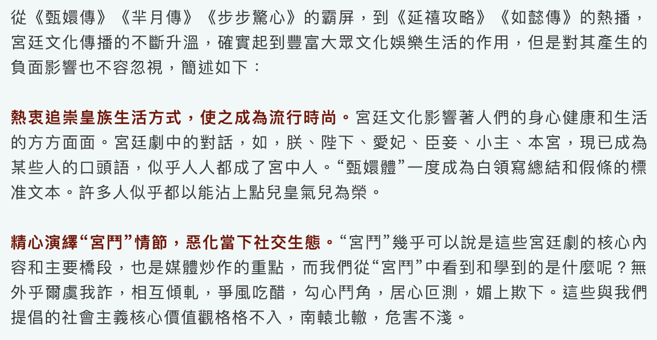 北京日報的分析報導也指出,宮廷文化影響著人們的身心健康和生活各方面,宮廷劇中的對話像是「朕、陛下、愛妃、臣妾、小主、本宮」,現已成為部分人的口頭禪,好像大家都成了宮中人,「甄嬛體」也一度成為上班族的趣味文本,不論寫報告、或講話都變得相當文言文,甚相當或是宮廷劇中核心的內容幾乎都是「爾虞我詐、相互傾軋、爭風吃醋」,對於社會是有害的。