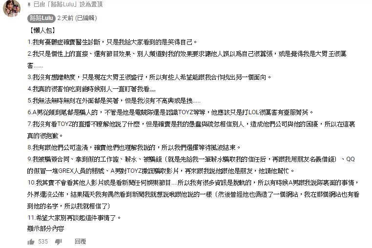 造成「Toyz」嚴重困擾?!暴食網紅「路路」落淚坦言「被騙」 鄭重道歉:確實是我的愚蠢與疏忽