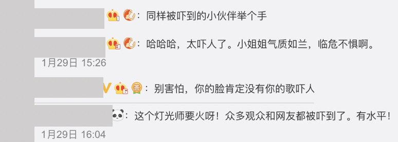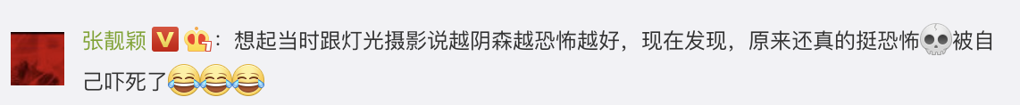 張靚穎看見網友瘋傳的截圖後,也在自己的微博上回應:「想起當時跟燈光攝影說越陰森越恐怖越好,現在發現,原來還真的挺恐怖,被自己嚇死了」,而網友也紛紛留言:「哈哈哈,太嚇人了。小姐姐氣質如蘭,臨危不懼啊」、「同樣被嚇到的小夥伴舉個手」、「別害怕,你的臉肯定沒有你的歌嚇人」、「這個燈光師要火呀!眾多觀眾和網友都被嚇到了,有水平!」