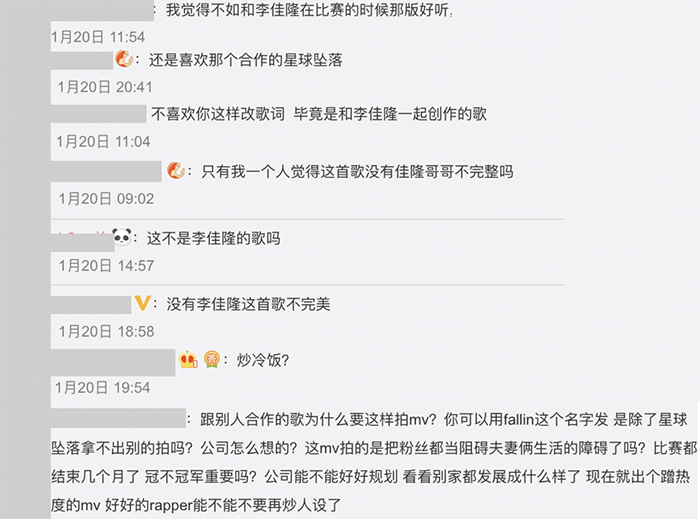 然而網友看見這首歌沒有李佳隆一起演唱時,也傻眼的留言:「只有我一個人覺得這首歌沒有佳隆哥哥不完整嗎」、「不喜歡你這樣改歌詞 畢竟是和李佳隆一起創作的歌」、「沒有李佳隆這首歌不完美」、「跟別人合作的歌為什麼要這樣拍mv?你可以用fallin這個名字發,是除了星球墜落拿不出別的拍嗎?」、「我覺得不如和李佳隆在比賽的時候那版好聽」
