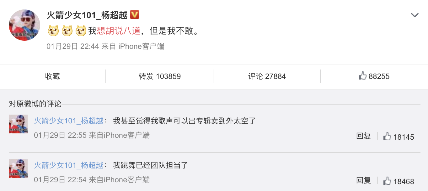29日晚上,楊超越在微博上發了一則貼文:「我想胡說八道,但是我不敢。 」,而她便開始在留言處發表她的「胡言亂語」,像是:「我昨天下午長高了2米」、「我跳舞已經團隊擔當了」、「我甚至覺得我歌聲可以出專輯賣到外太空了」、「我昨天肚子餓地球被我吃了4分之1」,而她發出這條微博後,許多網友紛紛猜測她是不是在抱怨「網友對她過分嚴苛」。
