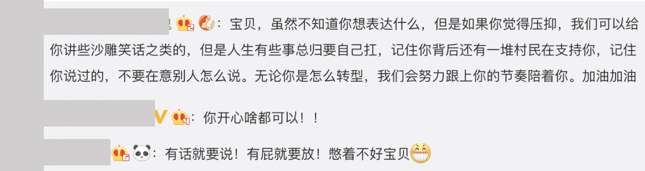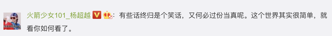 而她最後一則留言是:「有些話終歸是個笑話,又何必過份當真呢。這個世界其實很簡單,就看你如何看了。」,許多粉絲看見楊超越較為不尋常的貼文後,也紛紛留言關心:「雖然不知道你想表達什麼,但是如果你覺得壓抑,我們可以給你講些沙雕笑話之類的,但是人生有些事總歸要自己扛,記住你背後還有一堆村民在支持你」、「你開心啥都可以!」、「有話就要說!有屁就要放!憋著不好」