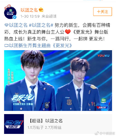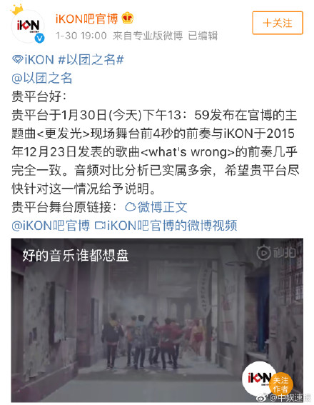 1月30日時,優酷綜藝節目《以團之名》在微博發佈選手齊舞主題曲《更發光》寫著「努力的新生,會擁有百種精彩,成長為真正的舞臺主人公《更發光》舞臺版熱血上線!新生與你,一路同行,一起拼 更發光!」希望大批粉絲點讚,沒想到不久以後iKON吧官博卻指出「以團之名主題曲抄襲iKON」,表示「貴平臺於1月30日(今天)下午13:59發佈在官博的主題曲<更發光>現場舞臺前4秒的前奏與iKON於2015年12月23日發表的歌曲<what's wrong>的前奏幾乎完全一致。音訊對比分析已實屬多餘,希望貴平臺儘快針對這一情況給予說明」。
