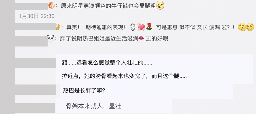 在官方釋出的節目花絮照中,有網友發現迪麗熱巴穿著淺色的牛仔褲有些顯胖,腿部的曲線以及胯部也成為網友討論的地方,網友見狀後也紛紛留言:「原來明星穿淺顏色的牛仔褲也會顯腿粗」、「是不是又長肉了?」、「胖了說明熱巴姐姐最近生活滋潤,過的好唄」,但也有網友認為熱巴根本就不胖,依然還是心目中的女神。