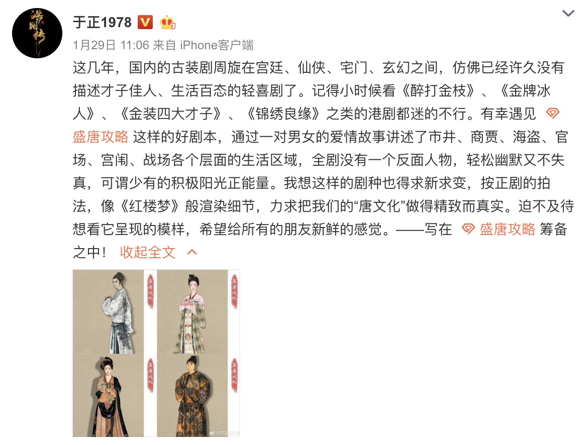 于正提到:「這幾年,國內的古裝劇周旋在宮廷、仙俠、宅門、玄幻之間,彷彿已經許久沒有描述才子佳人、生活百態的輕喜劇了」,並說自己有幸遇見《盛唐攻略》這樣的好劇本,通過一對男女的愛情故事講述了市井、海盜、官場、戰場各個層面的生活區域,全劇「沒有一個反面人物」,輕鬆幽默又不失真,可謂少有的積極陽光正能量。于正釋出這樣的訊息後,也讓網友們非常期待演員名單。