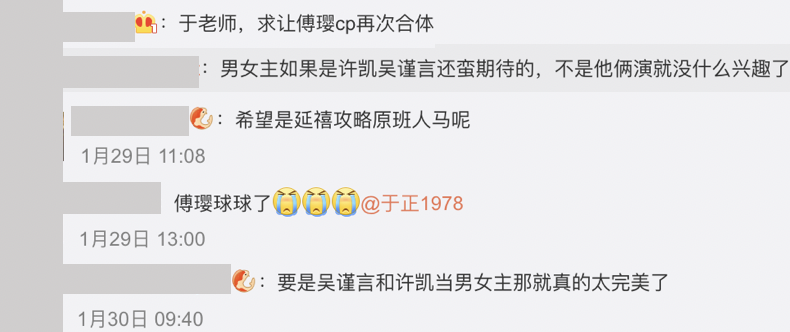在《延禧攻略》中,女主角「魏瓔珞」和「傅恆」儘管沒有如願的走到最後,可每當兩人相遇時,一片癡心的傅恆所說的每一句都讓觀眾們感到非常虐心,而這次於正的新劇《盛唐攻略》,網友們也紛紛留言:「于老師,求讓傅瓔cp再次合體」、「男女主如果是許凱吳謹言還蠻期待的,不是他倆演就沒什麼興趣了」、「希望是延禧攻略原班人馬呢」、「傅瓔求求了」、「要是吳謹言和許凱當男女主那就真的太完美了」