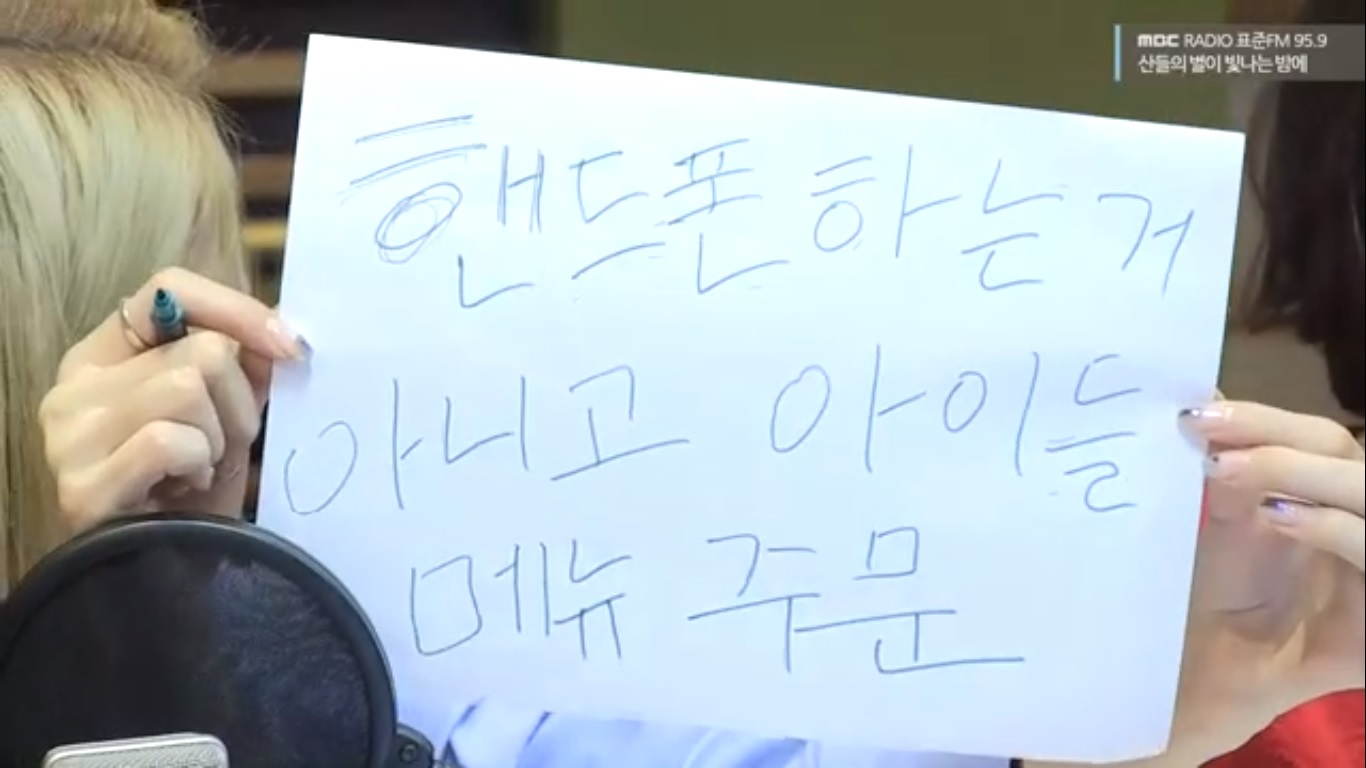 近期韓國電台「看得見的」廣播節目「燦多的星光閃耀的夜晚」中,是主要來賓的GFriend,在節目將接近尾聲的廣告時間,突然間在紙上寫了幾行字,對著鏡頭展示,紙上的內容是「不是在玩手機,是在幫孩子們(成員)點餐」,此舉是為了解釋成員們在節目錄製的時候,廣播節目廣告的空閒時間,使用手機的原因。