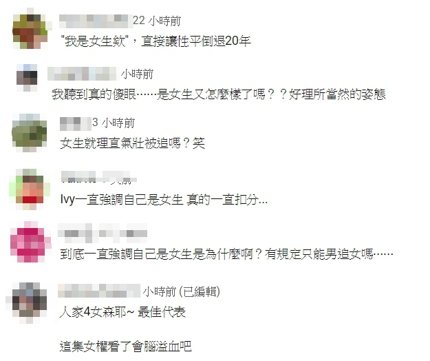 聽完Ivy的言論,引發許多網友們砲轟:「我是女生欸 直接讓性平倒退20年」、「我聽到真的傻眼.......是女生又怎麼樣了嗎??好理所當然的姿態」、「女生就理直氣壯被追嗎?笑」、「Ivy一直強調自己是女生 真的一直扣分」、「到底一直強調自己是女生是為什麼啊?有規定只能男追女嗎......」、「人家4女森耶~最佳代表 這集女權看了會腦溢血吧」。