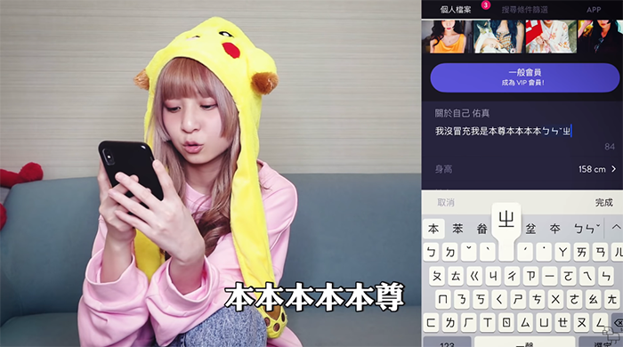 本本近日決定透過交友軟體來實測一個晚上能交多少男朋友,值得一提的是,有別於別的創作者,本本這次完全使用本名以及自己的照片,她也玩笑表示,「反正冒充我的人那麼多,我現在就要冒充本本的身分!」,開始使用交友軟體之後,本本也十分順利,立刻配對了許多男生!