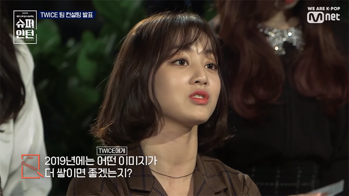 由JYP娛樂和Mnet播出的節目《Super Intern超级實習生》,31日,公司旗下團體TWICE也前往節目錄製,而9人也首度在節目中坦承出道以來的心境變化。節目中,隊長志效向主持人問起「你覺得2019年,TWICE應該建立起什麼樣的形象」,接著講起TWICE面臨形象轉變的抉擇,並透露「我們一直不斷在討論過去我們展現出的可愛和陽光的一面」。