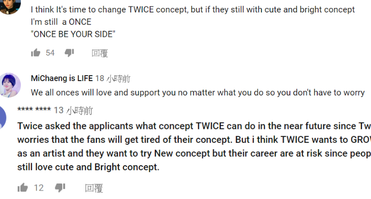 此話一出網友出現兩派歧見,有人仍然支持TWICE堅持原本風格並鼓勵到「真的不需要擔心,真正的粉絲會一直支持你們的」,也有粉絲分析「TWICE其實是擔心粉絲已經看慣他們的可愛風格,可能無法接受他們突然轉變」,不過也有網友提出不同建議並表示「希望TWICE能走Girl Crush」、「也想看看不同風格」。