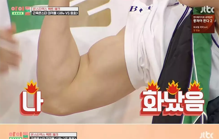 另一成員元虎的身形又比隊長更為健壯,過去在節目《Idol Room》測量他的手臂為竟將近41公分,而隊長還小輸他僅有33公分,十分驚人。去年9月,MONSTA X出席泰國演唱會時,曾經脫下上衣,讓在場的姜丹尼爾都忍不住比個讚,表示尊敬。