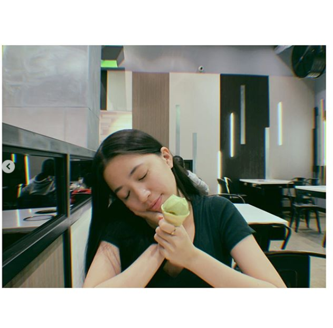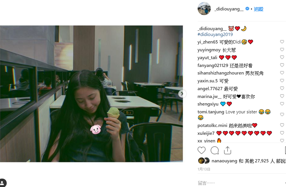 上月,歐陽娣娣在個人IG分享和友人外出用餐的貼文,照片中,歐陽娣娣和手裡的抹茶冰淇淋合照,雖然低頭且閉眼睛還是難掩天生氣質外貌,不過疑似因為T恤領口太低,透過友人的「上帝視角」一拍,意外讓胸前春光乍現,事後歐陽娣娣雖然以小豬貼圖補救,不過「欲蓋彌彰」的效果仍讓網友超害羞並直呼「男友視角」、「你很會嘛」、「捕捉性感娣娣」。