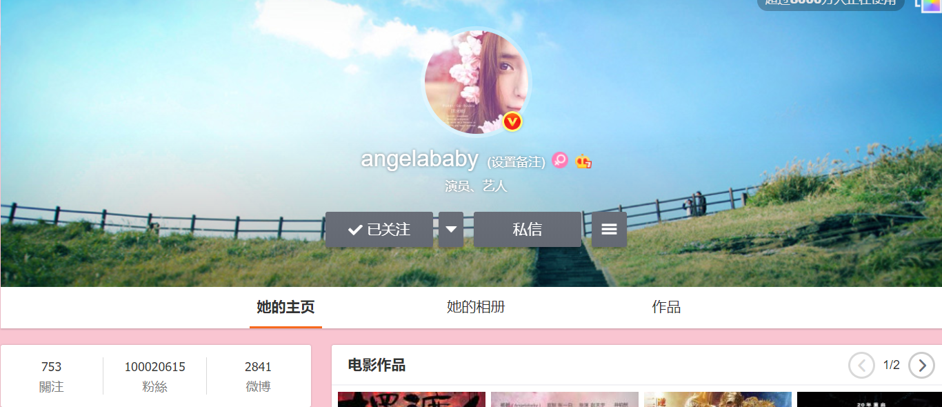 大陸藝人Angelababy楊穎於微博的追蹤人數終於突破1億,現年僅29歲的她出道至今已邁入第15年,起初雖以精緻五官和身材成為模特兒,不過力求突破的她也累積不少戲劇作品,4日晚間,才登上央視春晚,一個晚上,讓她的粉絲成為大陸娛樂圈中第4位暴衝破億的藝人。
