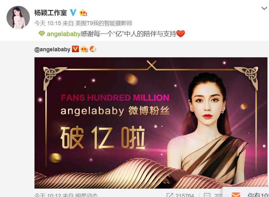 5日,新年第一天,Angelababy的微博就捎來破億的好消息,事實上,她是從2009年12月17日才開始使用微博,也是在她將演藝事業重心從日本、香港,轉移到大陸發展的時候。對此,Angelababy工作室的官方微博也特別為此祝賀,一早就發文表示「感謝每一個『億』中人的陪伴與支持」。