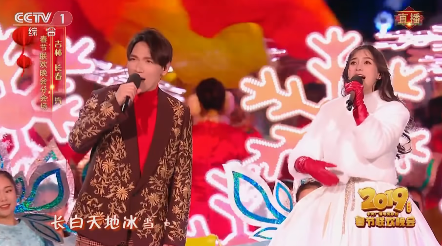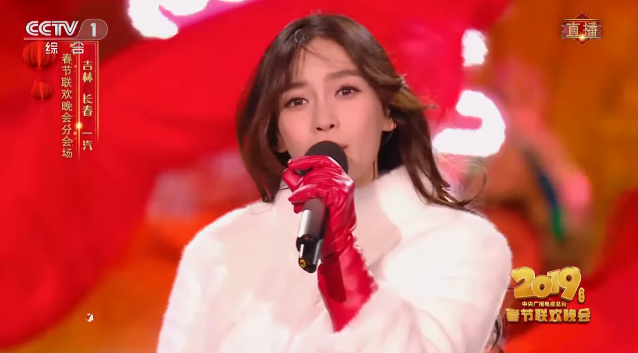 4日,Angelababy也登上中央電視台舉辦的春節晚會,當晚甚至和實力派歌手楊宗緯合唱《雪花賦》,當晚身穿白裙相當呼應歌曲背景,不過當天僅有零下九度低溫,雖然服裝看起來很保暖,不過從電視直播畫面中,Angelababy的頭髮一直不斷被冷風吹亂,也讓粉絲直呼天冷還要唱歌真的很不容易。