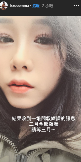 事情自爆發之後,雙方各說各話,讓外界霧裡看花,而艾瑪則在自己的IG限時動態中發文:「結果收到一堆問教練課的訊息,二月全部額滿,請等三月」,事業不受影響。