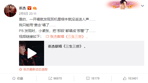 至歌曲後半段,張杰疑似放棄,直接摘掉耳機繼續演唱,溫暖又穩健的歌聲也讓他博得滿堂彩!而當天晚上,微博便有話題瘋傳「張杰耳返是不是出問題」,張杰也親自發文為大家解答:「是的,一開唱就發現耳機裡根本就沒返送人聲……我只能用『意念』唱了……」,他同時也坦承自己有小失誤,將「那段」誤唱成了「那管」,不過粉絲仍大讚張杰不說根本沒人發現!