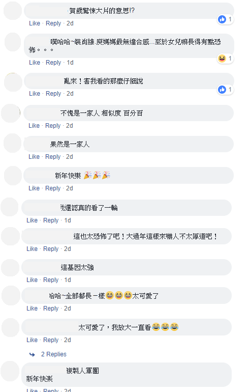 照片發布之後,不少網友看到紛紛笑翻,留言打上:「賀歲驚悚大片的意思!?」、「庾媽媽最無違合感...至於女兒嘛長得有點恐怖」、「亂來!害我看的那麼仔細說」、「哈哈哈,嚇一跳,太有趣了!新年快樂」、「不愧是一家人 相似度 百分百」、「哇,全家都長一個德性!」只能說哈林老師這次真的成功騙倒一票粉絲,這次逗趣的拜年,也讓粉絲相當印象深刻!