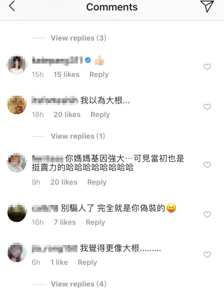 不過另有網友指出,媽媽年輕時的照片乍看之下真的很像好友大根,兩人同樣都有漂亮的尖下巴,笑起來時更有彎月形的雙眼,令粉絲笑稱「明明是大根」、「我覺得更像大根」、「我以為大根」然而也有網友認為這樣的留言太過分。