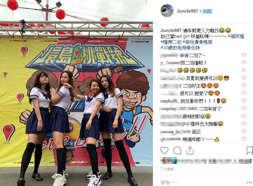 此外,老公蔡阿嘎也在個人FB上曬出和二伯以及其他三位年輕制服妹的合照,除了預告10日將抵達嘉義站,竟直言「今天的辣妹年齡有點高」,面對罕見穿著性感的二伯,網友紛紛盛讚「裡面最辣的那個」、「站在一起根本同年齡」、「不像生過孩子的媽」,更有人調侃到「阿嘎晚上可能會找你」、「晚上穿這套嘎哥就不用睡了」。