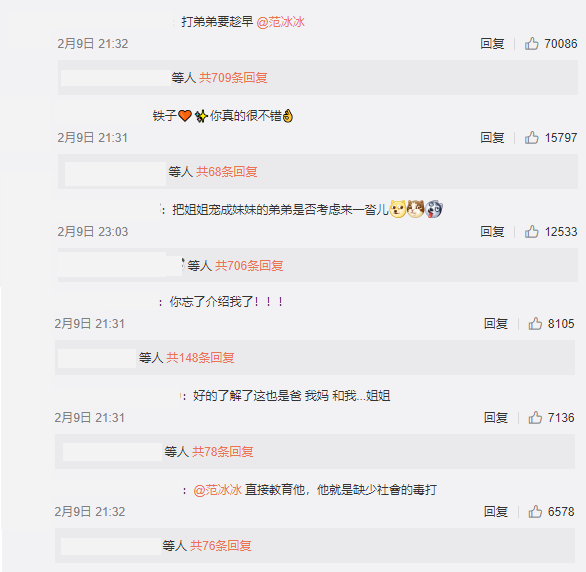 許多粉絲紛紛留言說道:「你忘了介绍我了!!!」、「你真的很不錯」、「把姐姐寵成妹妹的弟弟」、「哥哥啊啊啊」、「范丞丞你太皮了」、「冰冰妹妹太好看了!」、「太年輕了一家人! ! !」,也有粉絲搞笑標記范冰冰表示:「打弟弟要趁早」、「丞丞又在被姐姐打的邊緣徘徊」、「你的哥哥沒打算要打嗎?」