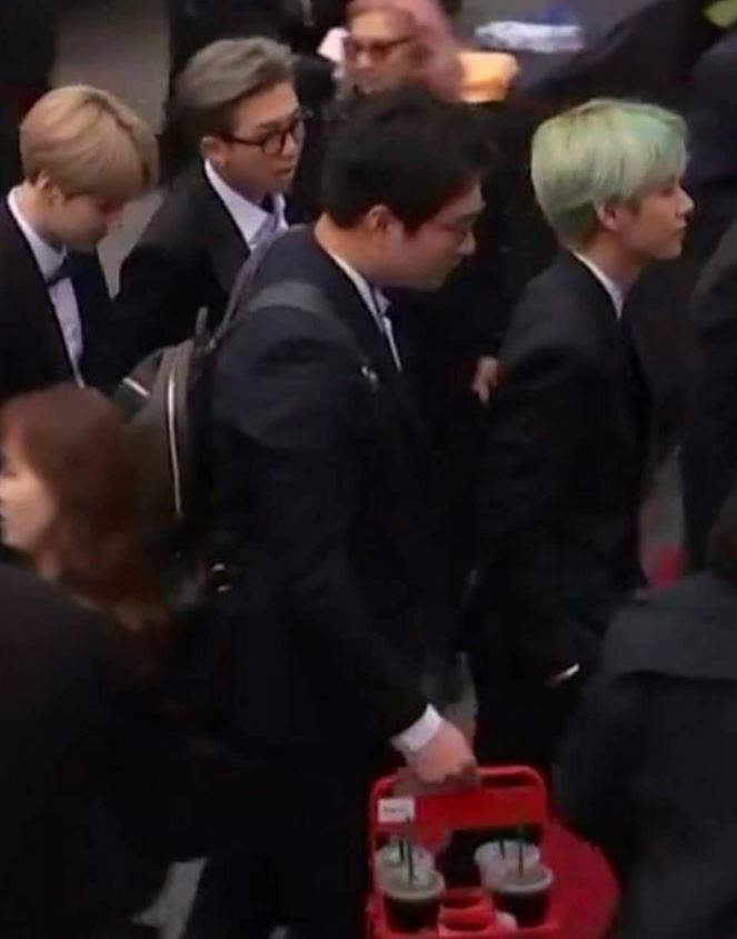 而在典禮途中,防彈少年團的暖心經紀人甚至隨身提著手搖飲料,緊跟在成員身邊,似乎擔心成員會餓到位此粉絲也直呼感謝。此外,防彈少年團也相當享受典禮演出,包括被粉絲捕捉到5成員一起隨著音樂擺頭,此外,當美國鄉村歌手Dolly Parton演出時,Jimin和V還跟著對嘴唱,不少畫面顯示防彈少年團相當享受整個典禮過程。