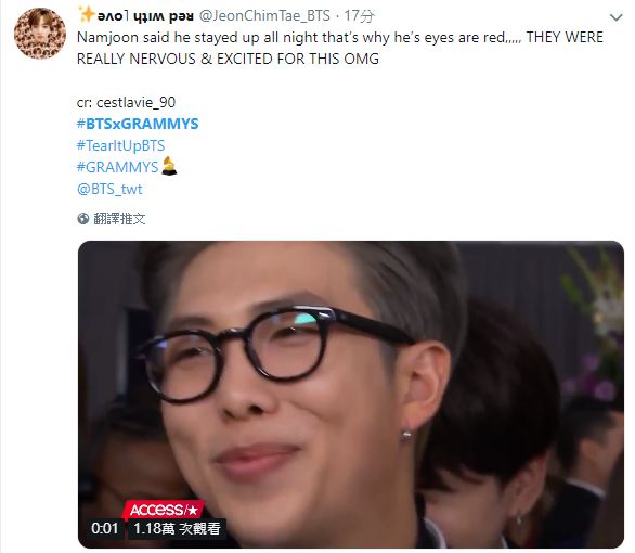 美國時間10日(台灣時間11日)韓國男團BTS防彈少年團,將出席於洛杉磯舉行的《第61屆葛萊美獎》,除以頒獎人身分出席,更以去年5月發行的專輯《Love Yourself 轉 'Tear'》入圍「最佳唱片包裝獎」,雖然最終未能成功奪獎,不過全球的ARMY(BTS粉絲名)仍然引以為榮,不少成員在典禮現場的可愛畫面也一一曝光。