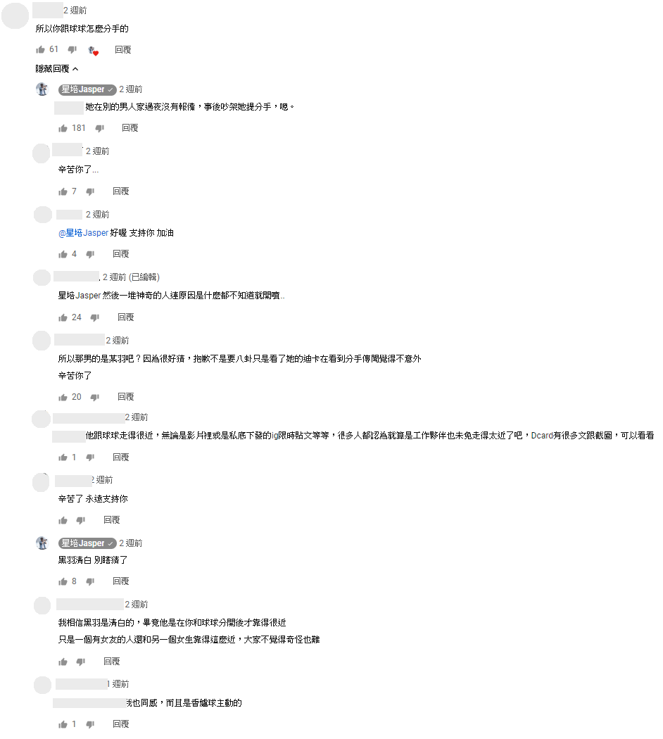 在這支影片的下方,有網友詢問:「所以你跟球球怎麼分手的」,星培則直接回應,「她在別的男人家過夜沒有報備,事後吵架她提分手,嗯。」,表示是因為球球在別人家過夜導致兩人吵架,在吵架過後,球球就提出分手。因為許多網友猜測球球過夜的對象是黑羽,星培也為黑羽澄清:「黑羽清白 別瞎猜了」。