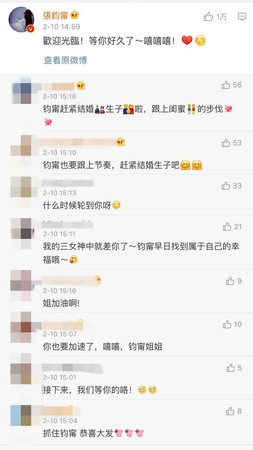 而她產子的消息曝光後,張鈞甯也在第一時間在微博留言恭喜,並跟小初打招呼,「歡迎光臨!等你好久了~嘻嘻嘻」。不料PO文一出,網友卻一面倒的歪樓,開始追問「什麼時候輪到你」、「鈞甯趕緊結婚生子啦」、「鈞甯也要跟上節奏吧,趕緊結婚生子」、「接下來我們等妳囉!」