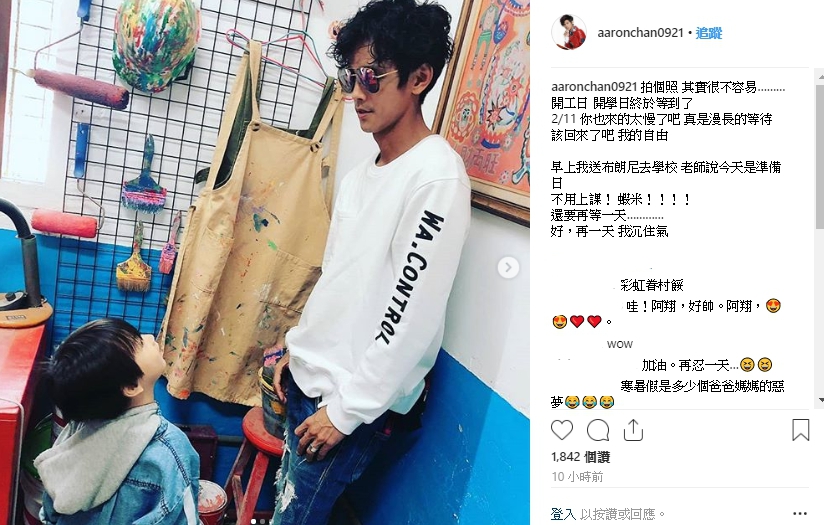 阿翔老婆Grace也在臉書透露前一日忙到很晚,就是為了準備布朗尼今日開學的上學用品,經過漫長的9天年假,終於等到孩子開學的這一天。阿翔也抑制不住興奮,開心在社群網路分享喜悅:「2/11你也來的太慢了吧!真是漫長的等待,該回來了吧,我的自由!」只見阿翔一早就親自把孩子送到幼稚園門口,想不到老師卻對他傳達「噩耗」表示:「今天是準備日,不用上課。」讓他當場崩潰,「蝦米!!!!還要再等一天………」老婆Gracec還開玩笑表示「我很擔心等下老爺吃完早餐會提議把我休了」讓網友笑翻。