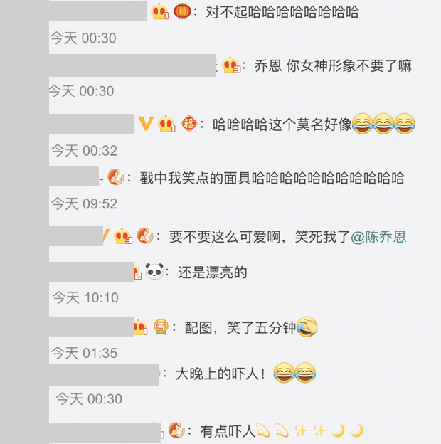 底下網友們紛紛留言:「笑了五分鐘」、「要不要這麼可愛啊,笑死我了」、「對不起哈哈哈哈哈哈哈哈」、「還是漂亮的」、「哈哈哈哈這個莫名好像」、「喬恩 你女神形象不要了嘛」、「戳中我笑點的面具哈哈哈哈哈哈哈哈哈哈哈」,但也有網友覺得這造型有些怪異,說道:「有點嚇人」、「大晚上的嚇人!」