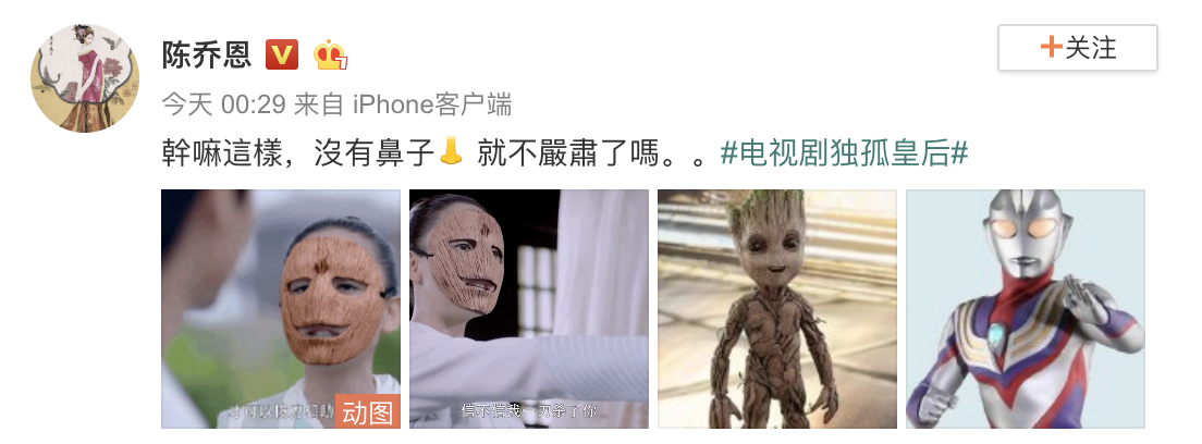陳喬恩在劇中從獨孤伽羅少女時期演起,賦予角色活潑、俠義的個性,為了拯救被權貴綁架的民女,她以女扮男裝的造型行俠仗義,戴上了一個木製的面具,此片段卻不斷被網友們吐槽,陳喬恩本人也在微博上貼出照片並寫下:「幹嘛這樣,沒有鼻子,就不嚴肅了嗎。」,此裝扮宛如鹹蛋超人以及電影《星際異攻隊》中的「格魯特」。