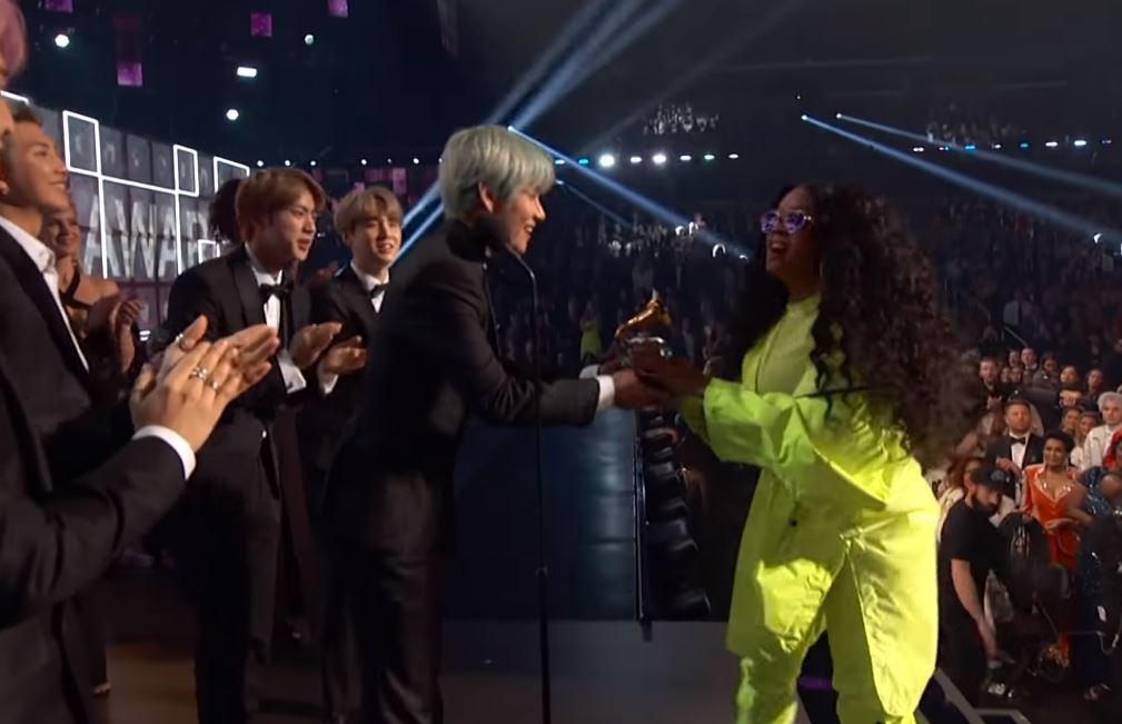 典禮中,防彈少年團以去年以去年5月發行的專輯《Love Yourself 轉 'Tear'》入圍「最佳唱片包裝獎」,雖最終以些微差距,輸給另一名美國歌手安妮克拉克(St. Vincent)的專輯《MASSEDUCTION》,不過ARMY(BTS粉絲名)仍然表示引以為榮。此外,當天團體也以頒獎人身分頒發「最佳R&B專輯」獎,獲獎人是美國創作歌手H.E.R,並由成員V親手頒獎給H.E.R,不過V疑似沒注意到麥克風還開著,不小心以韓語說出「就知道是你得獎」意外讓外界發現V迷弟的一面,除了成功站上葛萊美,也同時追星成功。