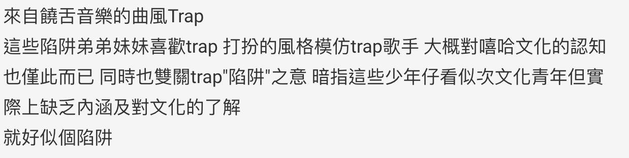 而這次神秘樂評人「stu sis」也整理出前十排行,但其實這榜單是他嘲諷現今大家跟風嘻哈的文化,實際上根本沒深入了解此文化,並稱這些人「陷阱弟、陷阱妹」,也引發網友們熱烈討論。