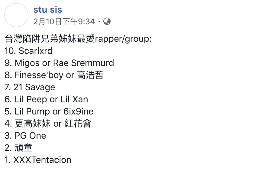 他在自己的粉絲專頁中分享「台灣陷阱兄弟姊妹最愛的Rapper/Group」,根據Dcard網友解釋,「陷阱妹」一詞的意思是來自饒舌音樂的曲風「Trap」,這些陷阱弟弟妹妹喜歡模仿trap歌手的風格,對嘻哈文化的認知也僅此而已,同時也有雙關為「陷阱」的意思,暗指這些少年實際上缺乏內涵及對嘻哈文化的了解,stu sis評選出的排行也是嘲諷「台灣人跟風嘻哈」。
