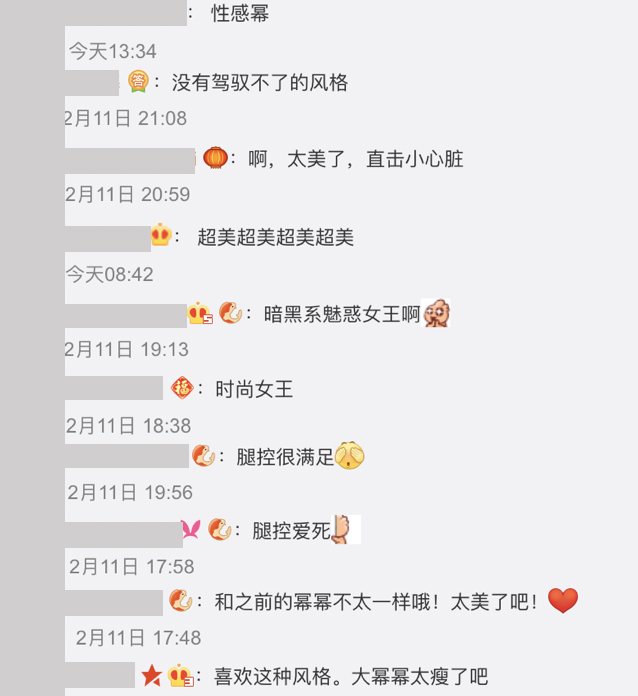 看見這組照片的網友也紛紛留言:「性感冪」、「超美超美超美」、「和之前的冪冪不太一樣哦!太美了吧!」、「腿控愛死」、「時尚女王」、「超好看的!腿又細又長又美~~~大美冪!嘗試多種風格」、「喜歡這種風格。大冪冪太瘦了吧」、「暗黑系魅惑女王啊」、「沒有駕馭不了的風格」、「啊,太美了,直擊小心臟」、「腿控很滿足」