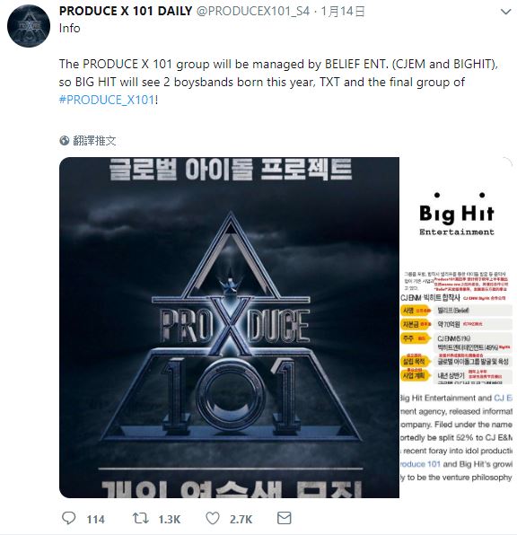1月,同一官方粉絲團也已經釋出消息指出,《PRODUCE_X101》將由經紀公司防彈少年團所屬經紀公司BigHit和Mnet的上層娛樂集團CJ E&M聯合推出男團,因此網友也預估,BigHit今年將推出兩個男團包括TXT和新一季的團體。