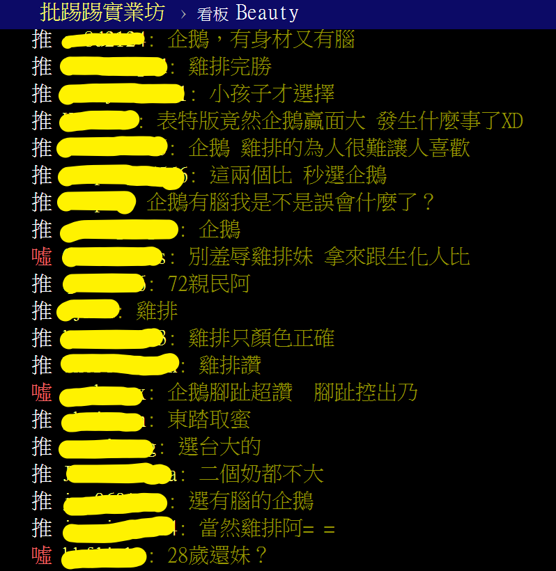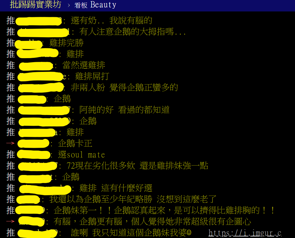 兩位目前都是網路上討論度極高、炙手可熱的「鄉民女神」,有網友在PTT「表特板」附上圖片和文字比較,立刻引起大量網友留言爭相討論,網友留言表示「雞排完勝」、「當然選雞排」、「阿純的好 看過的都知道」、「雞排 這有什麼好選」、「顏值跟身材都是雞排屌打企鵝」,另一方面也有網友支持企鵝妹表示「企鵝妹第一!!企鵝認真起來,是可以擠得比雞排胸的!」、「企鵝,有身材又有腦」、「企鵝妹人比較好」、「企鵝妹樂勝!」、「有腦選企鵝」。