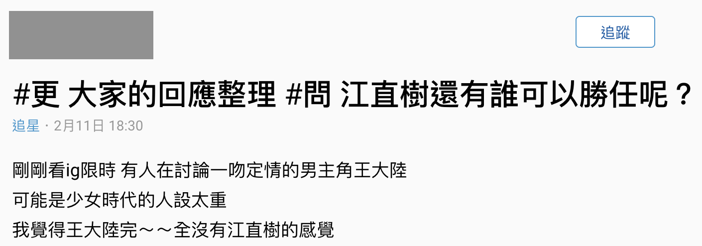 Dcard上網友發文寫道:「可能是少女時代的人設太重 我覺得王大陸完~~全沒有江直樹的感覺」,並發起「江直樹還有誰可以勝任?」的討論,而版主也拋磚引玉的貼了幾位男星,像是:胡宇威、吳尊、楊洋、鄧倫、胡一天、林彥俊等人,而底下網友呼聲前三高的則是「胡宇威」、「楊洋」和「胡一天」,而也有許多人認為王大陸比較適合演「阿金」,無法勝任男主角的角色。